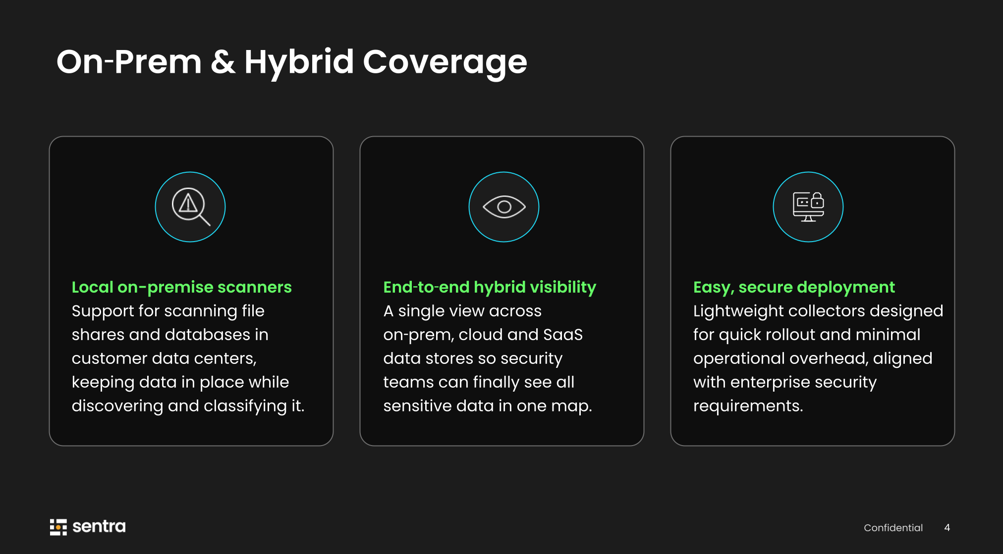 "How realistic is full coverage?" - very realistic. We essentially took the technology we built for our cloud scanners and packaged it for any private data center or on-premise environment. We ship lightweight local scanners, support all types of SMB and NFS file shares, and cover databases including MySQL, Oracle, Postgres, and more. Sentra also connects to your Active Directory to map access levels across identities, file shares, and databases.