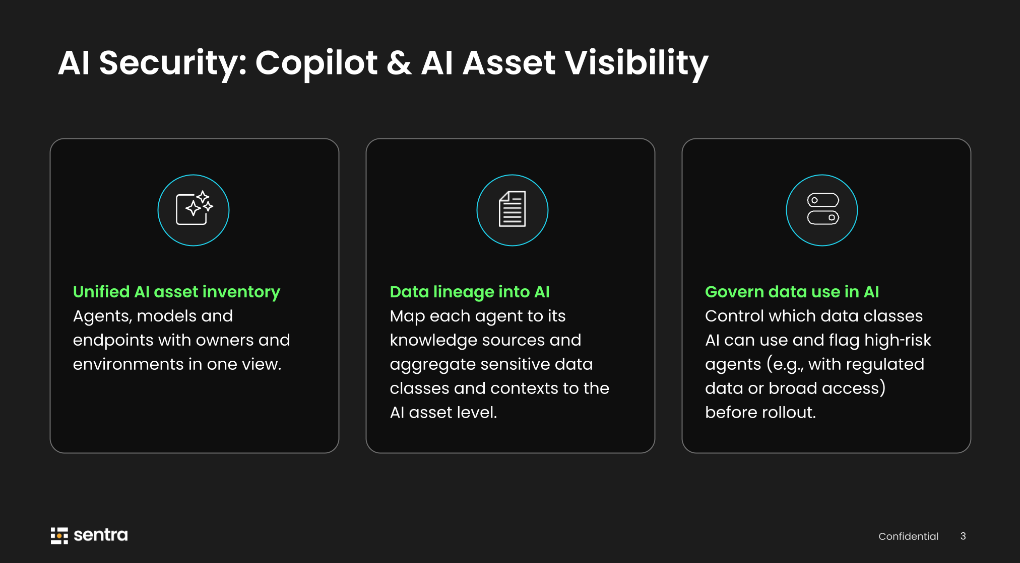 Govern Data Use in AI. Once you have that lineage, you can start making real policy decisions. These are the data classes we're comfortable using for copilots and agents; these are the ones that must never be touched. We flag high-risk agents, those with access to regulated data or broad permissions, before they roll out, not after something leaks.